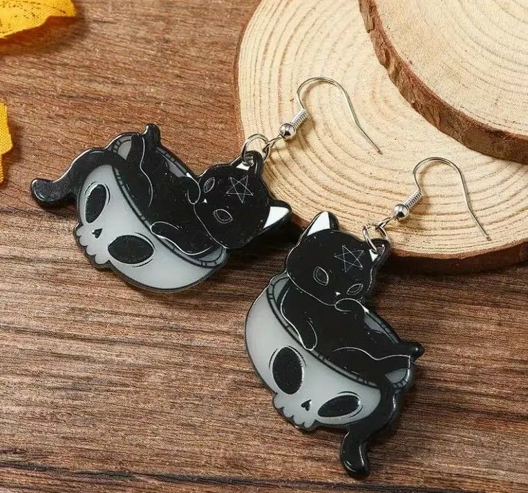 Boucles d'oreilles pendantes 2D - Chat noir gothique et crâne - Pendentif en acrylique plaqué K - Idéal pour soirées, tenue décontractée, cadeau gothique.