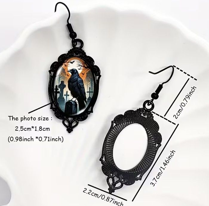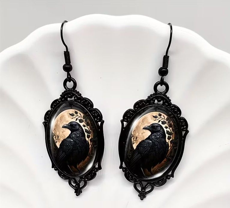Boucles d'oreilles pendantes Funky Raven Cameo avec cadre en dentelle noire, crochets d'oreille en alliage et fer, incrustation de verre - Bijoux d'oiseaux gothiques.