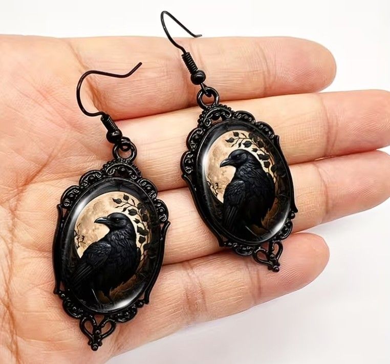 Boucles d'oreilles pendantes Funky Raven Cameo avec cadre en dentelle noire, crochets d'oreille en alliage et fer, incrustation de verre - Bijoux d'oiseaux gothiques.